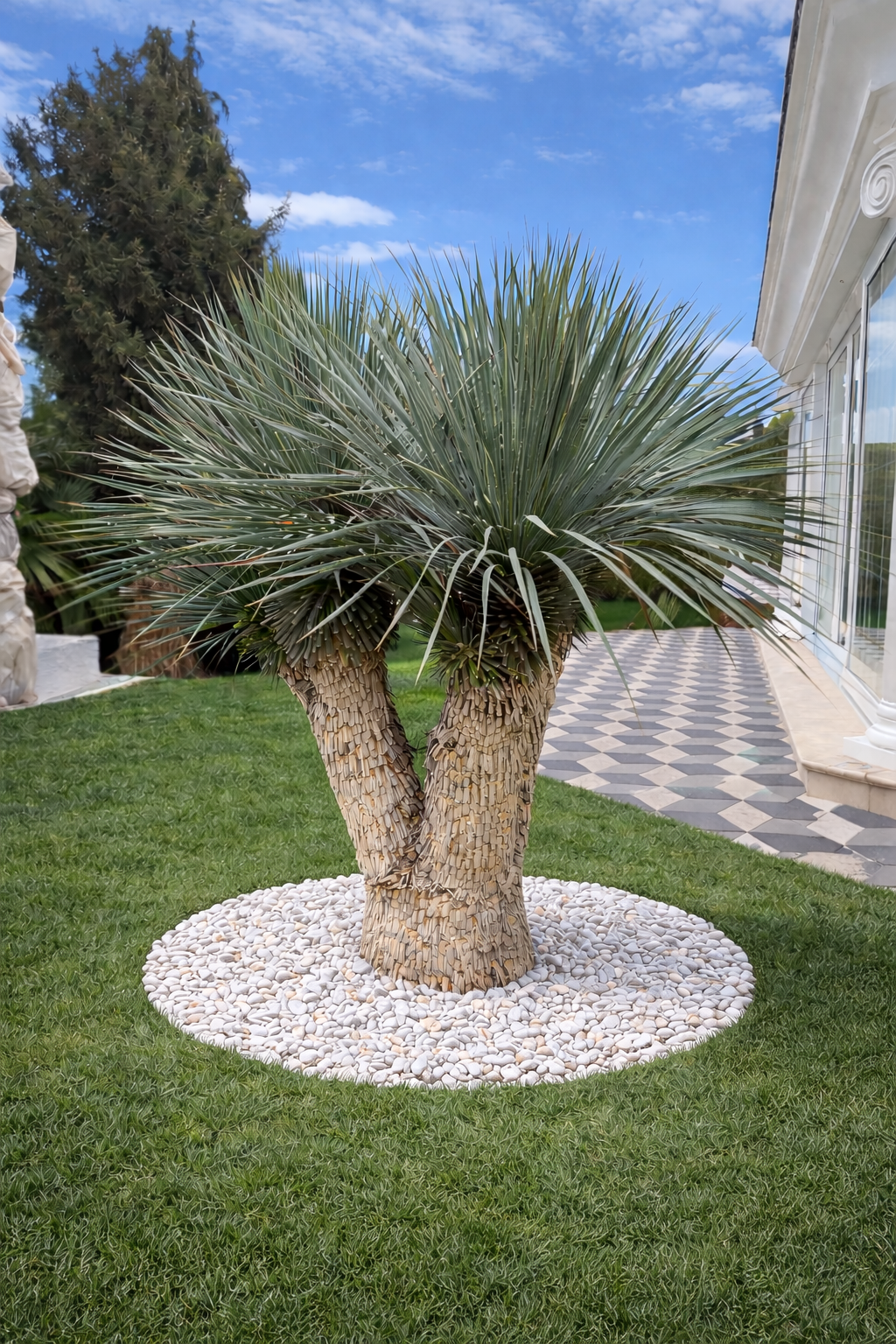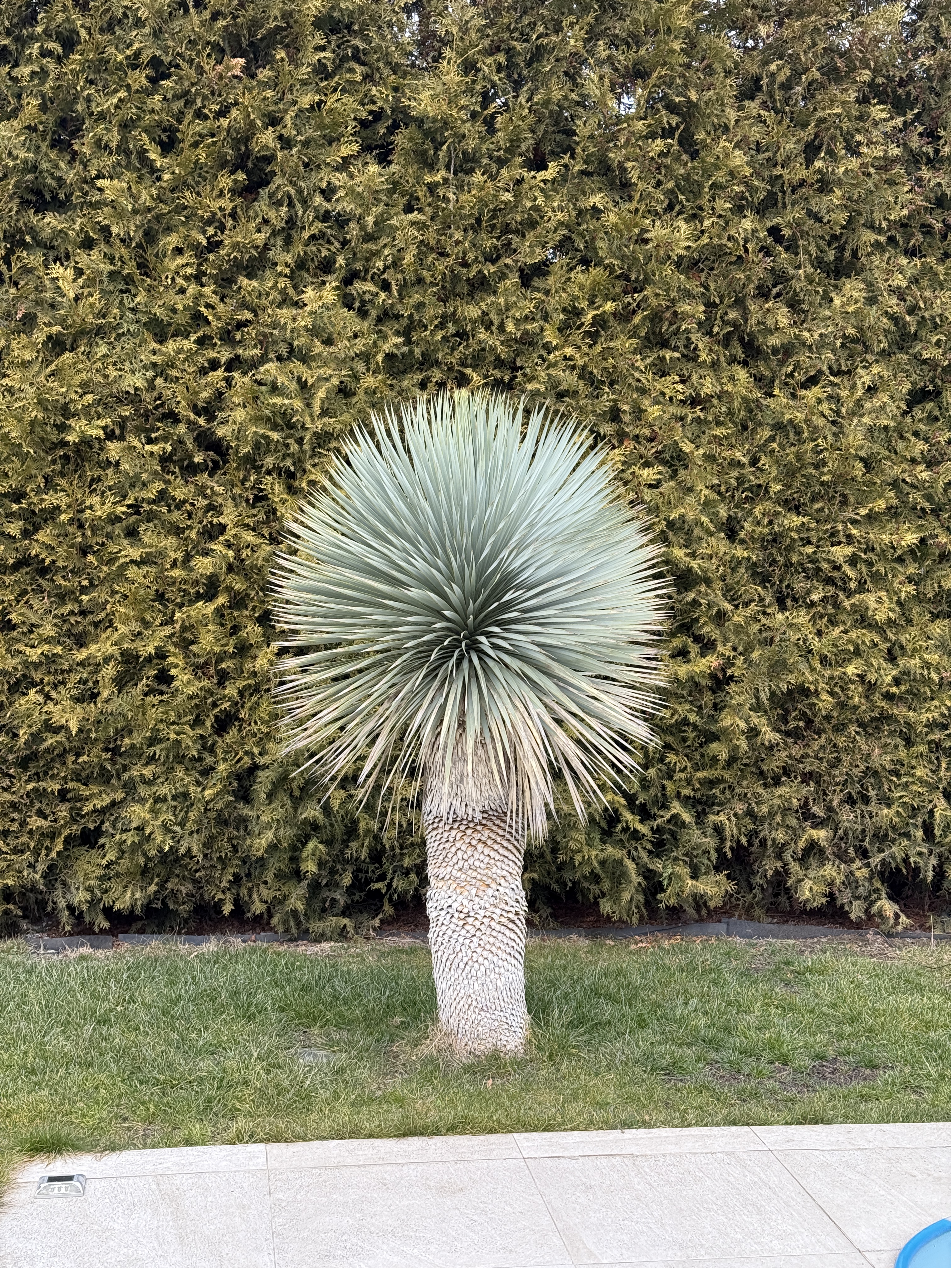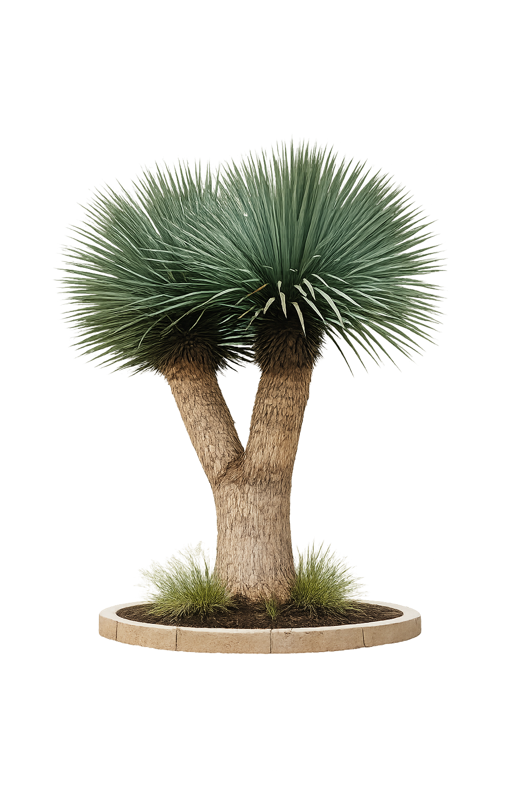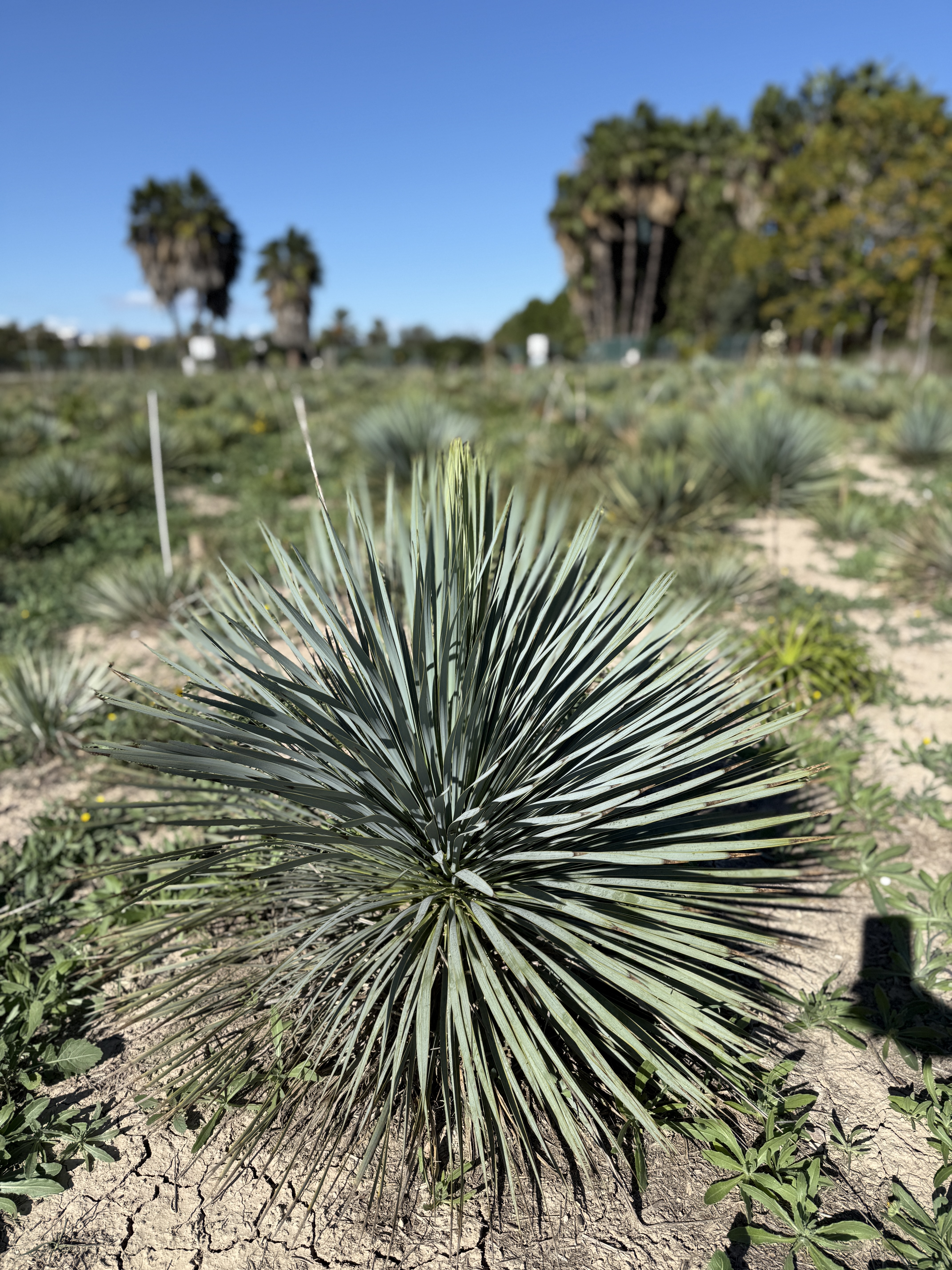 Vytváří solitérní kmen, zakončený hustou kulovitou korunou modrostříbrné barvy. Korunu tvoří jednotlivé úzké listy, zakončené špičkou. Kořeny rostliny se přizpůsobí jakémukoli prostoru